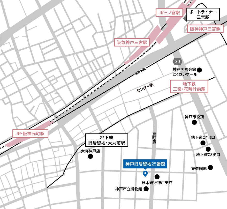 | アクセス | JR神戸線「三ノ宮」駅・阪急神戸線「神戸三宮」駅・阪神本線「神戸三宮」駅・ポートライナー「三宮」駅 徒歩7分 JR神戸線「元町」駅・阪神本線「元町」駅 徒歩6分 神戸市営地下鉄海岸線「旧居留地・大丸前」駅より徒歩5分 |